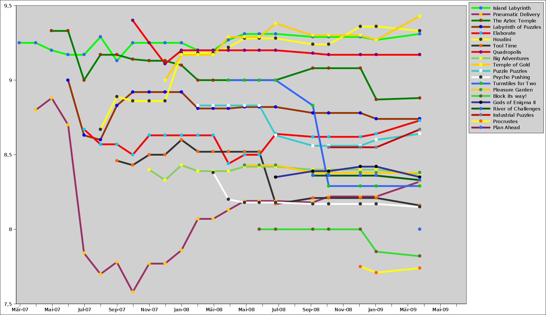 Levels of the Month -- ArchiveEach month, we take a closer look at excellent Enigma levels. Excellent levels are those with the highest average user ratings and the greatest number of ratings altogether. Thus it is your vote that determines the Level of the Month. So please rate the levels you play and do not forget to submit your ratings together with your scores at the end of each month. These are the featured Levels of the Month. The value in front is the current user rating, the number in brackets is the number of people who rated this level. Data is from October '08, ordered by rating: